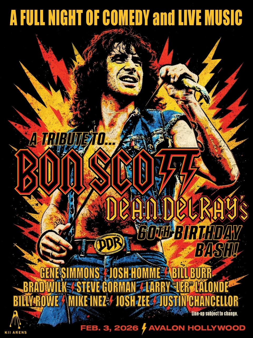 Dean Delray’s Comedy Show & ALL STAR Tribute to Bon Scott of AC/DC with Bill Burr, members of Kiss, Queens Of The Stone Age & Rage Against The MachineVenue: Avalon Hollywood | 1735 Vine St, Los Angeles, CA 90028